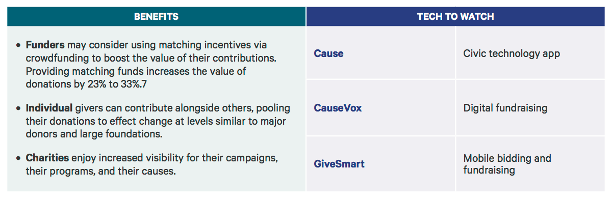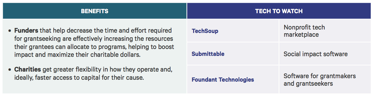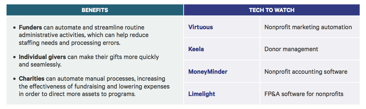From automation and crowdfunding to digital platforms and social media, philanthropy is about effecting change and tech-based solutions are helping to accelerate results. This white paper identifies six technology trends that promise to shape the future of giving — while increasing the impact donors and nonprofits can have as they pursue their philanthropic missions.