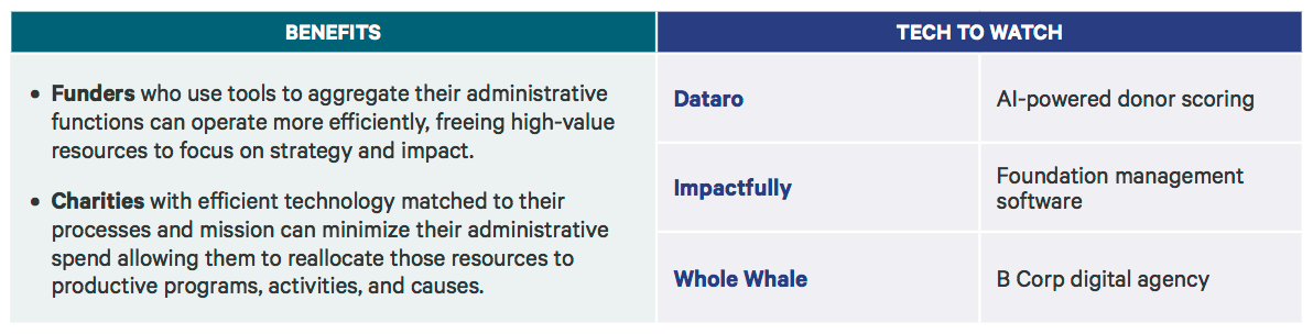 The broader philanthropic ecosystem relies on constant, effective engagement between donors and grantees in order to function, and technology can play a key role in facilitating those interactions while minimizing friction. It’s important for all the participants in the ecosystem to explore potential software, platforms, tools, and general resources that can augment core infrastructure and operations.