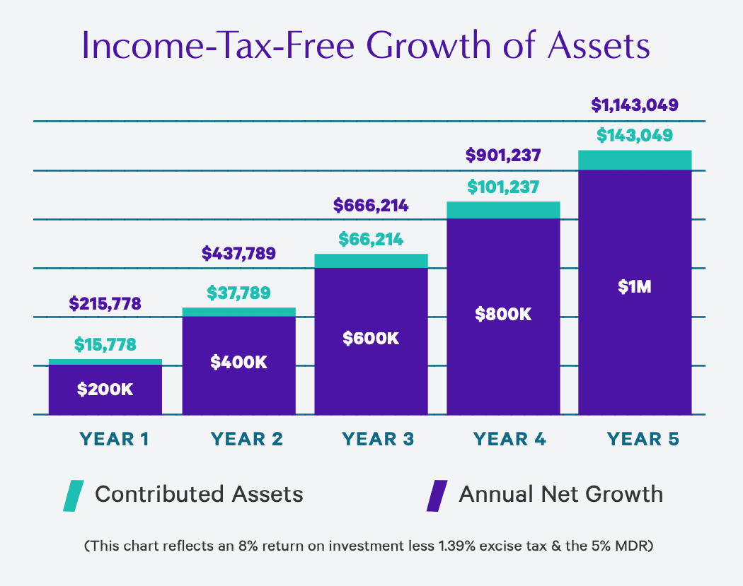 Let’s assume that Lucas follows through with his plan to contribute $200,000 to his private foundation every year over the course of five years. Because his assets will be able to grow in the tax-advantaged environment of the private foundation, after assuming an 8% growth rate and taking into account a 1.39% excise tax, the private foundation’s endowment will have increased by nearly $150,000 despite having made over $111,000 of charitable grants in satisfaction of the minimum distribution requirement (MDR) during these years. By the time Lucas retires, his foundation will be worth more than $1.1 million and he can focus on creating a lasting charitable legacy.